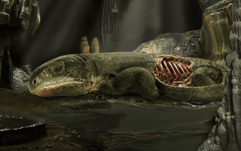 Με τη χρήση νετρονικής υπολογιστικής τομογραφίας (nCT) σε εξειδικευμένη εγκατάσταση στην Αυστραλία, οι ερευνητές κατάφεραν να εξετάσουν το απολίθωμα χωρίς να το καταστρέψουν. «Άρχισα να βλέπω δομές τυλιγμένες γύρω από τα οστά… υπήρχε ένα όμορφο περίβλημα δέρματος γύρω από τον κορμό, με υφή σαν ακορντεόν», ανέφερε ο Mooney. Το μοτίβο θύμιζε τις φολίδες των σύγχρονων σκωληκόσαυρων, μικρών ερπετών που ζουν υπόγεια.