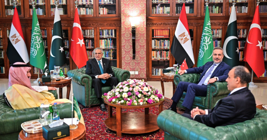 Το Πακιστάν, η Σαουδική Αραβία, η Τουρκία και η Αίγυπτος συζήτησαν «πιθανούς τρόπους για να δοθεί ένα πρώιμο και οριστικό τέλος» στον πόλεμο στη Μέση Ανατολή, δήλωσε ο υπουργός Εξωτερικών του Πακιστάν Ισάκ Νταρ το απόγευμα της Κυριακής.