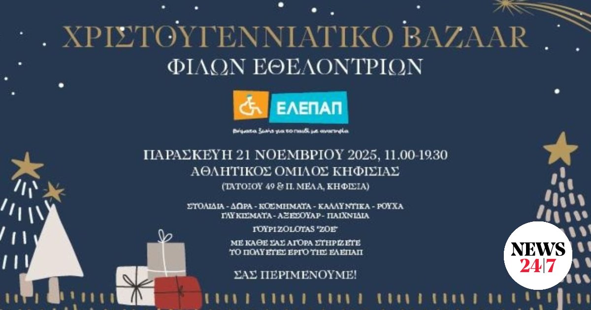 Οι Φίλες Εθελόντριες της ΕΛΕΠΑΠ σας προσκαλούν στο καθιερωμένο Χριστουγεννιάτικο Bazaar που διοργανώνουν την Παρασκευή 21 Νοεμβρίου 2025, από τις 11:00 το πρωί μέχρι τις 19:30 το απόγευμα, στον Αθλητικό Όμιλο Κηφισιάς (Τατοΐου 49 & Π. Μελά, Κηφισιά).