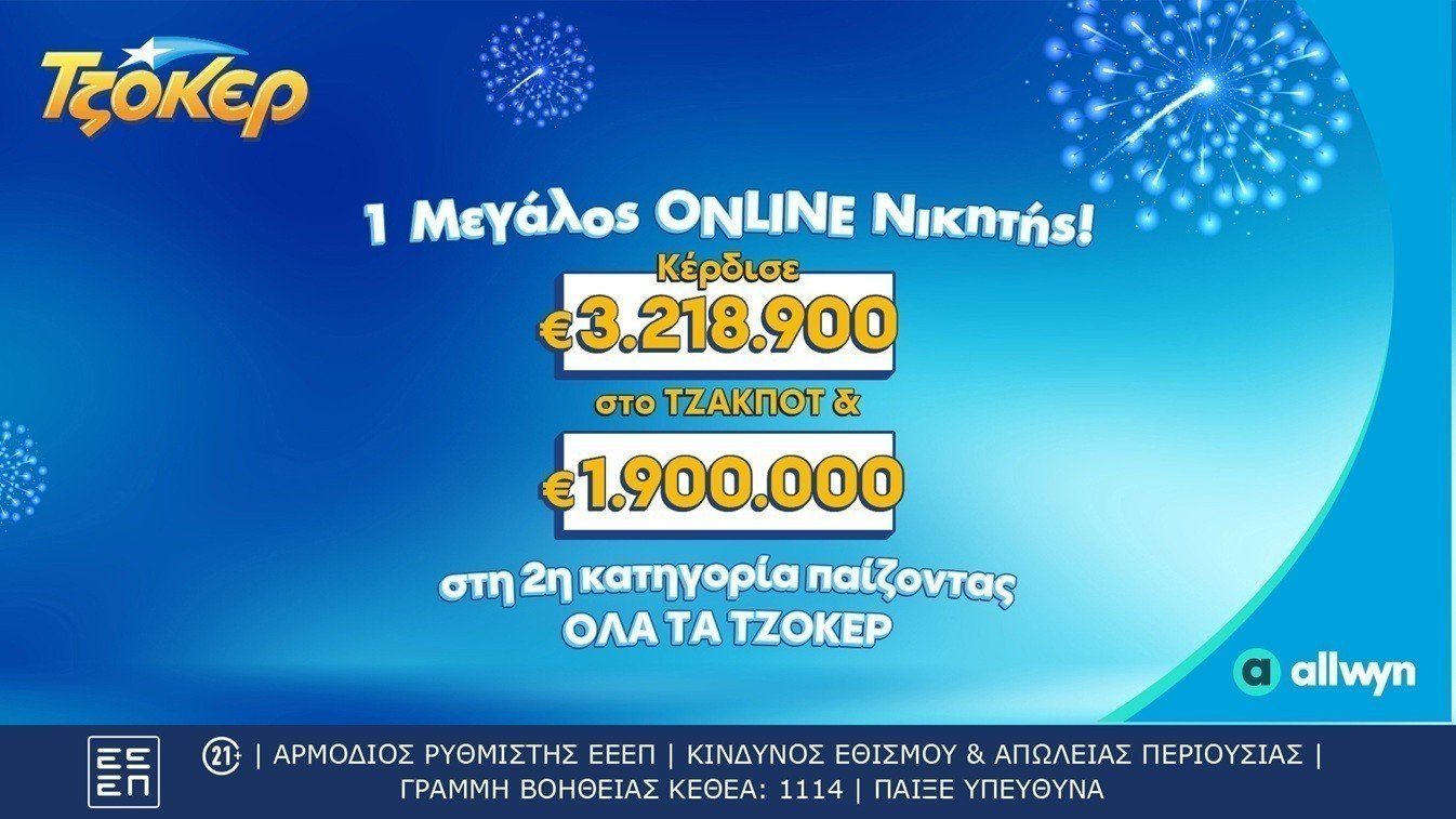Εκατομμυριούχος ξύπνησε σήμερα ένας τυχερός παίκτης του ΤΖΟΚΕΡ, ο οποίος στη χθεσινοβραδινή κλήρωση του παιχνιδιού κέρδισε το ποσό των 3.218.900,78 ευρώ στην πρώτη κατηγορία.