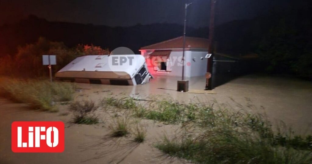 Σύμφωνα με την ΕΡΤ, δύο Γερμανοί τουρίστες κινδύνευσαν όταν το κατάλυμά τους, το όχημά τους και ένα τροχόσπιτο κατακλύστηκαν από τα νερά.