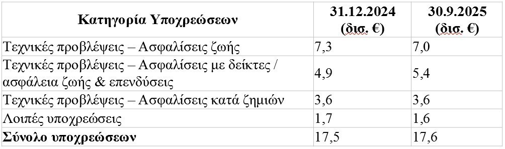 Την ίδια περίοδο (Ιανουάριος-Σεπτέμβριος 2025), οι αποζημιώσεις ανήλθαν σε 1,7 δισ. ευρώ για τις ασφαλίσεις ζωής, παρουσιάζοντας οριακή μείωση κατά 0,8% σε σχέση με την αντίστοιχη περίοδο του προηγούμενου έτους, και σε 0,8 δισ. ευρώ για τις ασφαλίσεις κατά ζημιών, παρουσιάζοντας αύξηση κατά 8% .