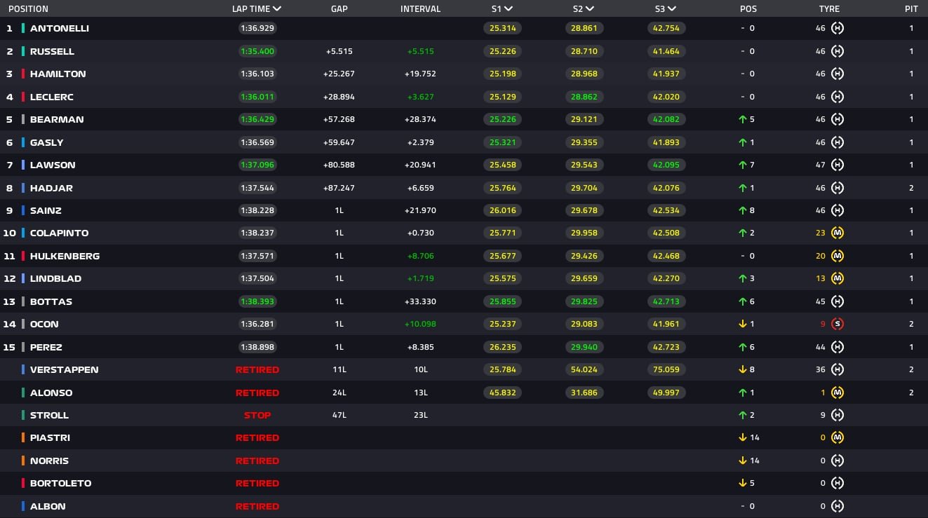 Από τη στιγμή που βρέθηκε στην κορυφή, ο Αντονέλι επέδειξε ατσάλινα νεύρα, διαχειρίστηκε άψογα μια επανεκκίνηση μετά την είσοδο του αυτοκινήτου ασφαλείας και κατέκτησε πανάξια την παρθενική του νίκη στη Formula 1. Ο Ιταλός τερμάτισε με διαφορά 5,5 δευτερολέπτων από τον ομόσταυλό του στη Mercedes, Τζορτζ Ράσελ, ο οποίος έχασε πολύτιμο χρόνο πίσω από τις Ferrari μετά την επανεκκίνηση, χάνοντας έτσι την ευκαιρία να διεκδικήσει τη νίκη στη Σαγκάη.