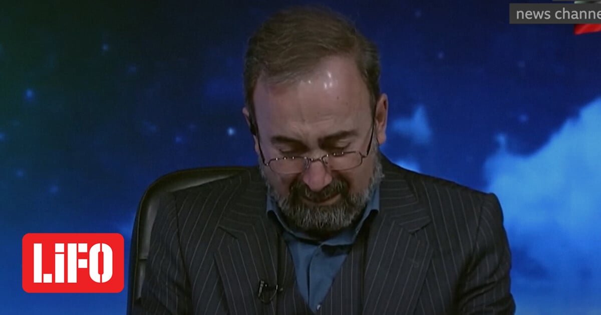 Ο δημοσιογράφος με δάκρυα στα μάτια, ξεσπά σε κλάματα διαβάζοντας μια ανακοίνωση του Ανώτατου Συμβουλίου Εθνικής Ασφάλειας, ενημερώνοντας το κοινό πως ο Χαμενεΐ έχει πέσει νεκρός.