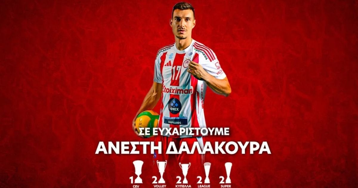 “Ο ΟΛΥΜΠΙΑΚΟΣ Σ.Φ.Π. ευχαριστεί θερμά τον Ανέστη Δαλακούρα για την πολύτιμη προσφορά του στην ομάδα βόλεϊ Ανδρών του συλλόγου. Ο Ανέστης Δαλακούρας ολοκληρώνει την αγωνιστική του πορεία, αφήνοντας πίσω του μια σημαντική παρακαταθήκη ήθους, αφοσίωσης και επιτυχιών.