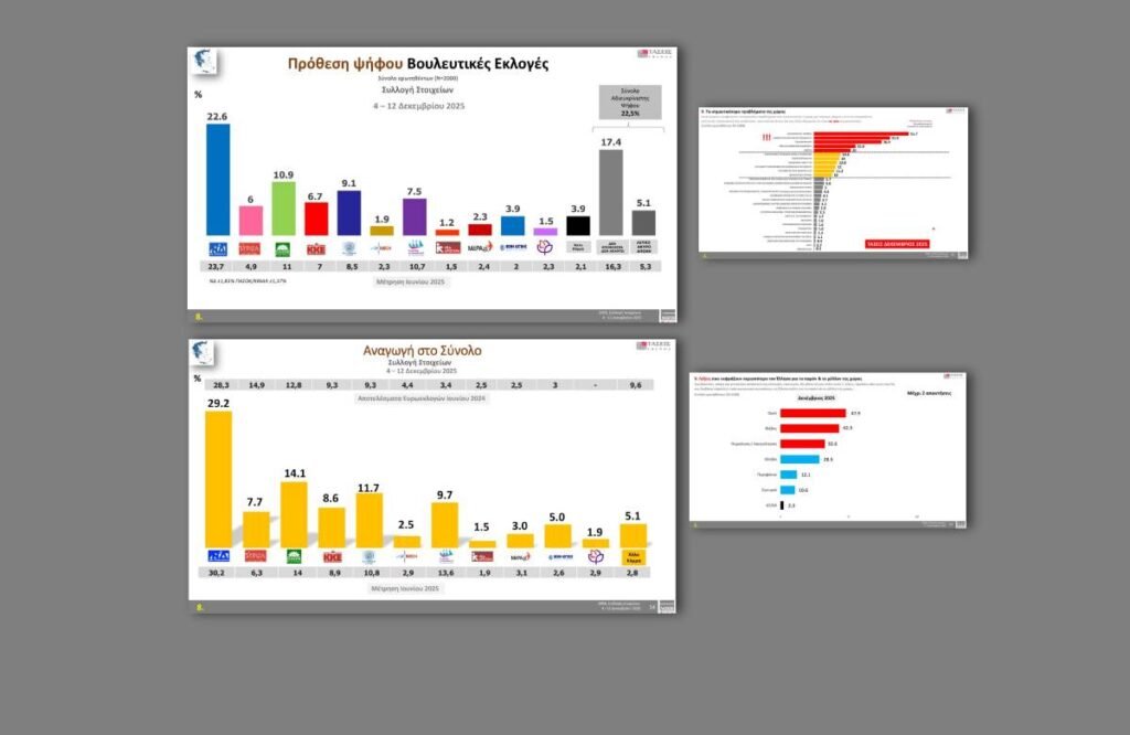 Στην πρόθεση ψήφου, η Νέα Δημοκρατία καταγράφει ποσοστό 22.6 % και ακολουθεί το ΠΑΣΟΚ με 10.9 %. Η Ελληνική Λύση συγκεντρώνει ποσοστό 9.1 %, η Πλεύση Ελευθερίας 7.5 %, το ΚΚΕ 6.7%, ο ΣΥΡΙΖΑ 6 %, η Φωνή Λογικής 3.9 %, το ΜέΡΑ25 2.3%, η Νίκη 1.9 %, το Κίνημα Δημοκρατίας 1.5%, και η Νέα Αριστερά 1.2 %.