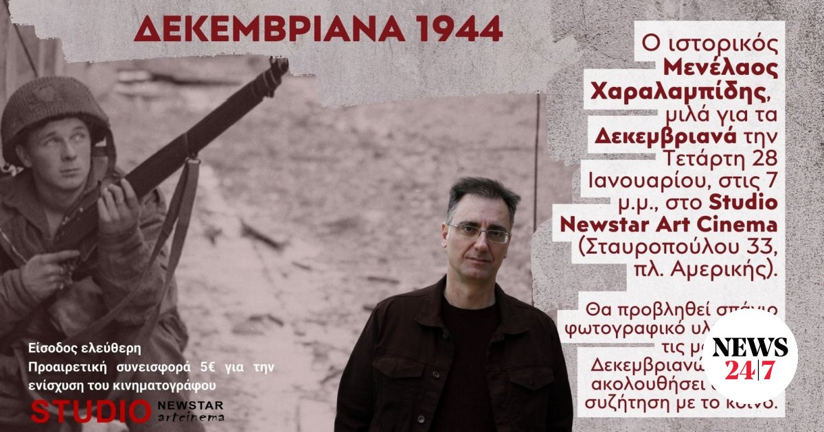 Την Τετάρτη 28/1 στις 7 το απόγευμα ο ιστορικός Μενέλαος Χαραλαμπίδης περιμένει το κοινό στον κινηματογράφο Studio Newstar Art Cinema (Σταυροπούλου 33, πλ. Αμερικής) για μια εφ’ όλης της ύλης συζήτηση για τα Δεκεμβριανά.