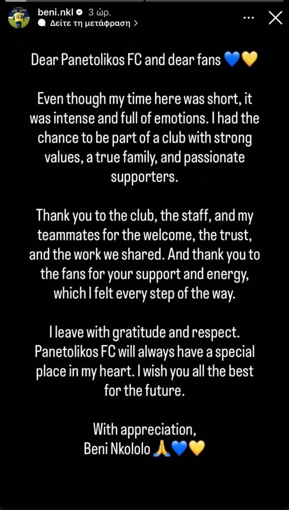 “Αγαπητή ΠΑΕ και φίλοι του Παναιτωλικού, Μπορεί το διάστημα που έμεινα στην ομάδα να ήταν σύντομο, αλλά ήταν γεμάτο έντονα συναισθήματα. Είχα την ευκαιρία να είμαι μέλος μιας ομάδας που είναι σαν μια πραγματική οικογένεια με ηθικές αξίες και παθιασμένους οπαδούς.