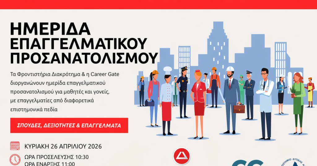 Τα Φροντιστήρια ΔΙΑΚΡΟΤΗΜΑ, (ο μεγαλύτερος Φροντιστηριακός Όμιλος σε Ελλάδα και Κύπρο σήμερα), σας προσκαλούν σε μια μοναδικὴ Ημερίδα Επαγγελματικού Προσανατολισμού με θέμα «Σπουδές, Δεξιότητες και Επαγγέλματα», η οποία θα πραγματοποιηθεί στο Συνεδριακό Κέντρο του Αρχαίου Ελαιώνα και σε παράλληλες αίθουσες του Πανεπιστημίου Δυτικής Αττικής (Οδός Πέτρου Ράλλη και Θηβών, Αιγάλεω).