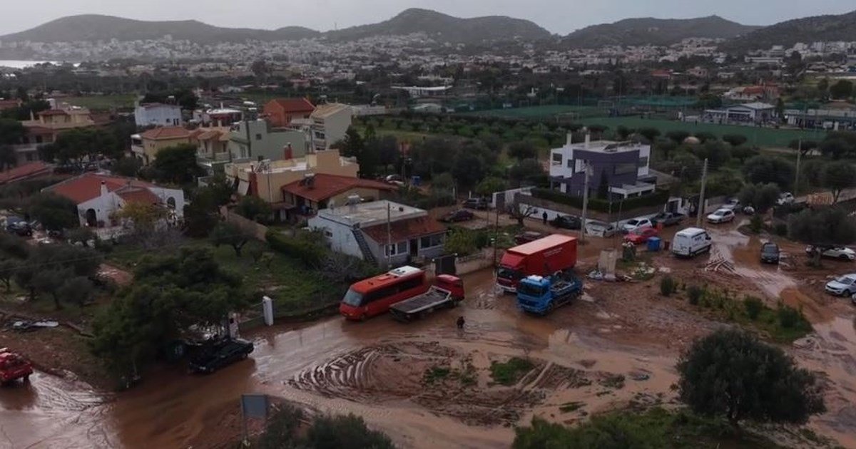 Τα εναέρια πλάνα από το drone του Orange Press Agency είναι αποκαλυπτικά και καταγράφουν μια περιοχή που κυριολεκτικά έχει βυθιστεί στη λάσπη.