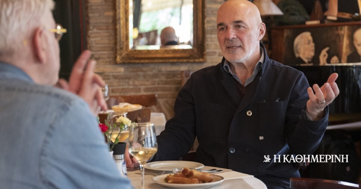 Γευματίσαμε στο αγαπημένο του στέκι, τον ιστορικό «Μαγεμένο αυλό» στο Παγκράτι. Ιδιοκτήτης του είναι ο Δημήτρης Θεοφίλου, γιος της Ηούς Θεοφίλου, αδελφής της Λίντας Αλμα, η οποία ήταν σύντροφος του θείου του, Μάνου Κατράκη. Το εστιατόριο είναι γεμάτο καλλιτεχνικές μνήμες. Εχει ταυτιστεί με τον Μάνο Χατζιδάκι, που ήταν καθημερινός θαμώνας μαζί με ιερά τέρατα του ελληνικού πολιτισμού. Οι τοίχοι είναι γεμάτοι από φωτογραφίες του Χατζιδάκι, του Οδυσσέα Ελύτη, του Νίκου Γκάτσου, του Δημήτρη Χορν, του Αλέξη Μινωτή, του Τσαρούχη. Θέλησε να καθίσουμε σε ένα ήσυχο τραπέζι, κάτω από τη φωτογραφία του Κατράκη. Επιλέξαμε σαλάτα καπρέζε (ντομάτα, μοτσαρέλα, ρόκα, μπαλσάμικο), σπρινγκ ρολς με λαχανικά, και μία μερίδα λαχανοντολμάδες. Συνοδεύσαμε το φαγητό με λευκό κρασί μοσχοφίλερο. Ολα ήταν υπέροχα, και εκείνος ανένδοτος για τον λογαριασμό. «Παίζω εντός έδρας», επέμενε.