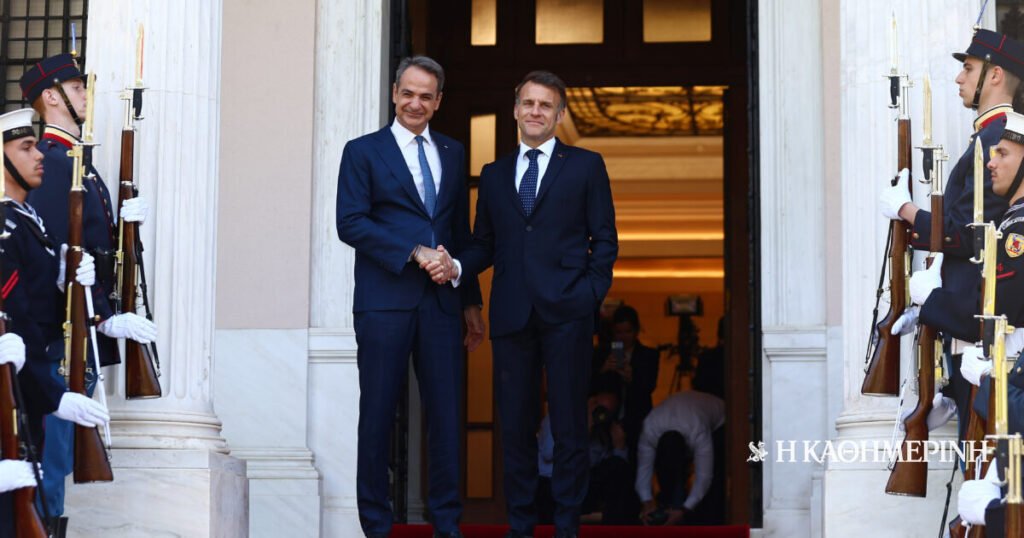 Η συνάντηση στο Μαξίμου πραγματοποιήθηκε, μετά την επιθεώρηση που έκαναν οι δυο ηγέτες στη φρεγάτα «Κίμων», την πρώτη γαλλικής κατασκευής Belharra, που έχει ενταχθεί στον ελληνικό στόλο.