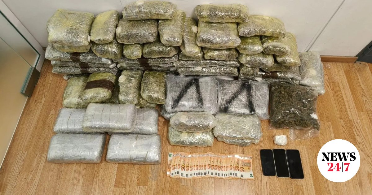 Κατασχέθηκαν 51 κιλά και 10 γραμμάρια ακατέργαστης κάνναβης, 100 γραμμάρια κοκαΐνης και 1.535 ευρώ.
