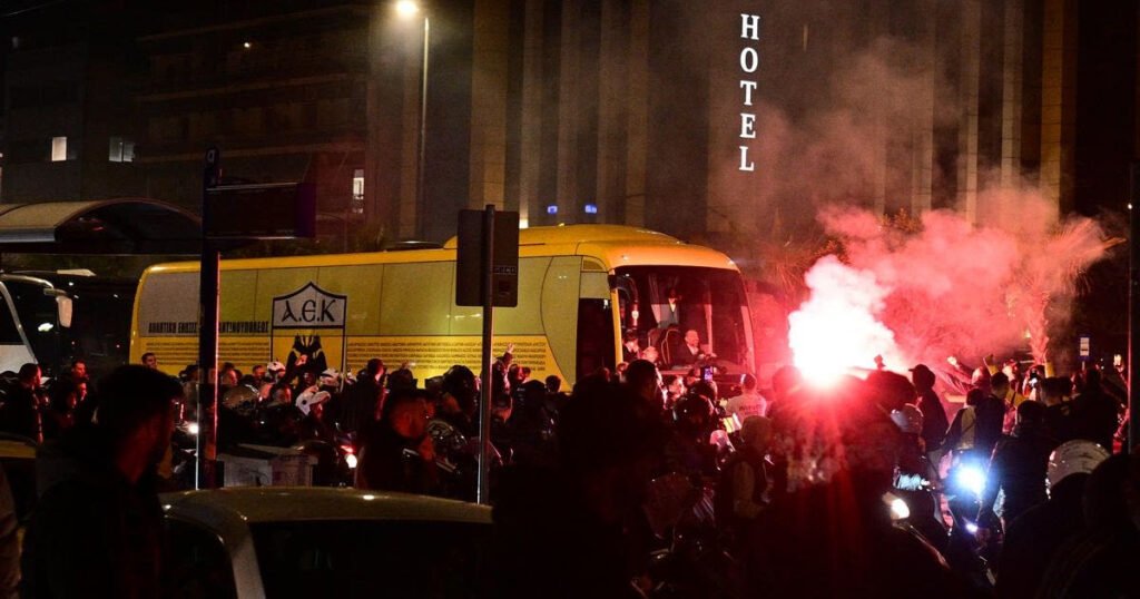 Το πούλμαν της ΑΕΚ συνέχισε την άνοδό του προς Αθήνα, δεν στάθμευσε στο ξενοδοχείο και με συνοδεία δεκάδες μηχανάκια έβαλε… πλώρη για τη Νέα Φιλαδέλφεια.
