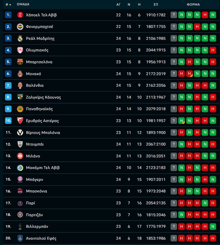 *Εκκρεμούν τα Ολυμπιακός-Φενέρμπαχτσε (17/3) και Χάποελ Τελ Αβίβ-Παρί (3/3)