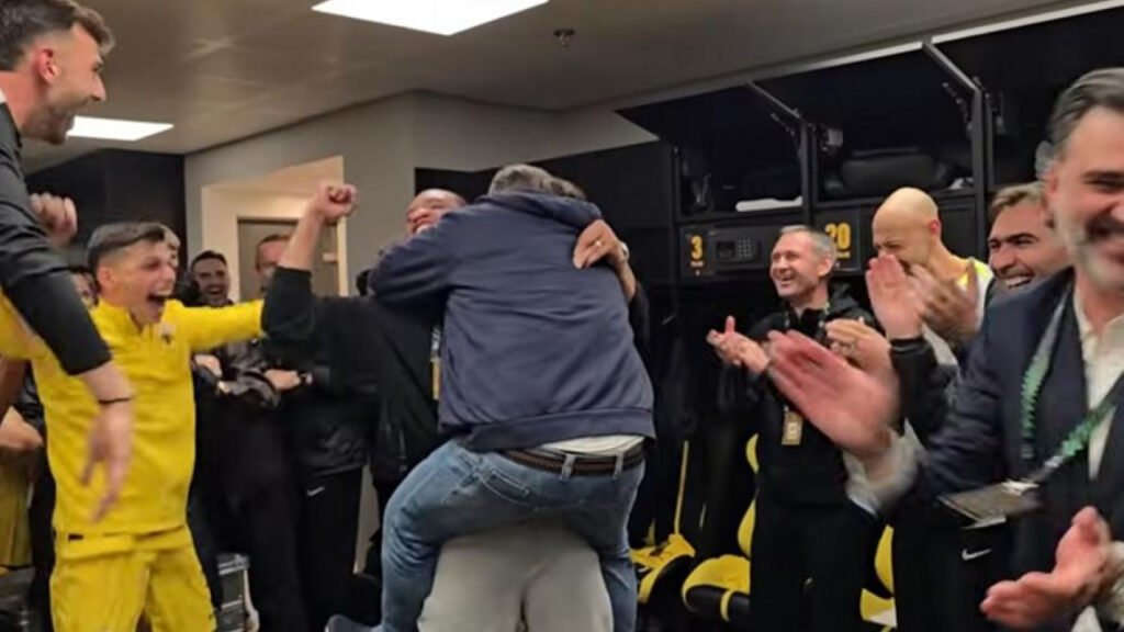 Μάλιστα, ο μεγαλομέτοχος της ΠΑΕ πήδηξε στην αγκαλιά του Αρόλντ Μουκουντί και άρχισε να χοροπηδά μαζί με τους παίκτες πανηγυρίζοντας τη μεγάλη νίκη.